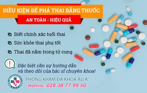 Phá thai bằng thuốc được thực hiện khi thai được 7 tuần tuổi trở xuống (tính từ ngày đầu tiên của kỳ kinh cuối cùng), thai đã vào bên trong tử cung và sức khỏe của người mẹ đảm bảo, không bị mắc các bệnh lý về nội khoa, phụ khoa như tim mạch, huyết áp hay dị ứng với thuốc.