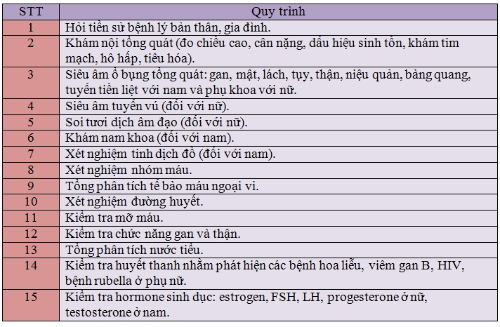 Thông thường một quy trình khám sức khỏe trước khi kết hôn bao gồm các bước sau:
